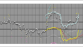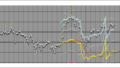 ただし、株価の上に黄色い蝶が舞い出した。レンジ相場と考えるなら、高値を警戒し始める時だ。トレンドライン(紫・黄緑)は一見問題ないように見えるが、紫の水準が高い。黄緑が先週の調整で下値を切り下げているので、先週の木曜日からの上昇が強い上昇である、とはできない。